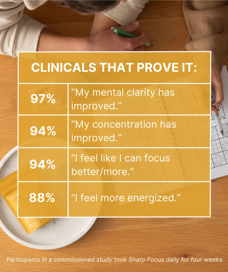 Our mental clarity and focus supplement includes ingredients like Caffeine for immediate focus support and Bacopa for longer-term benefits. Studies on Bacopa show that it benefits attention and cognition after four to six weeks of daily use.