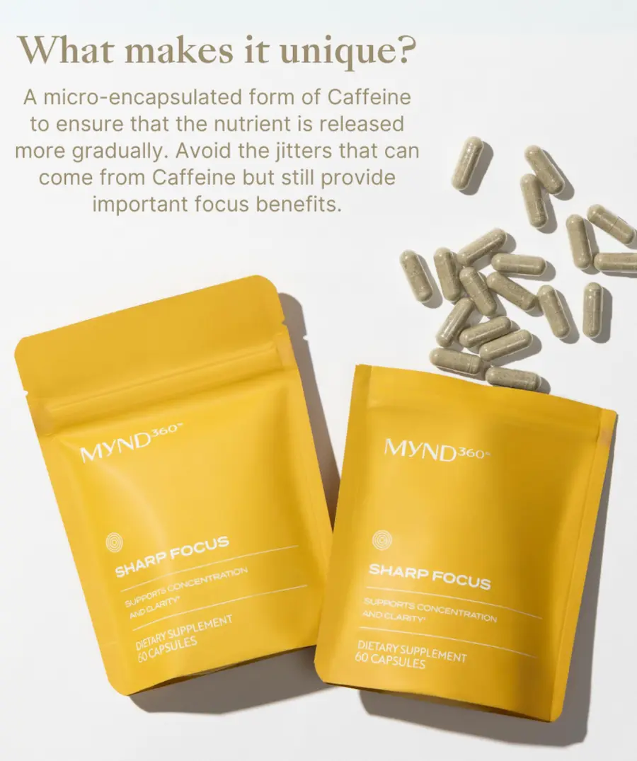 MYND360 Sharp Focus contains 100 mg of Caffeine per daily dose. This amount of Caffeine has been shown to be safe and effective at supporting focus, concentration, and reaction time, but low enough to avoid negative side effects in adults not sensitive to Caffeine. Our focus and brain health supplement utilizes a microencapsulated form of Caffeine to ensure that the nutrient is released more gradually. This format is designed to help you avoid the jitters that can come from Caffeine but still provide important focus benefits.